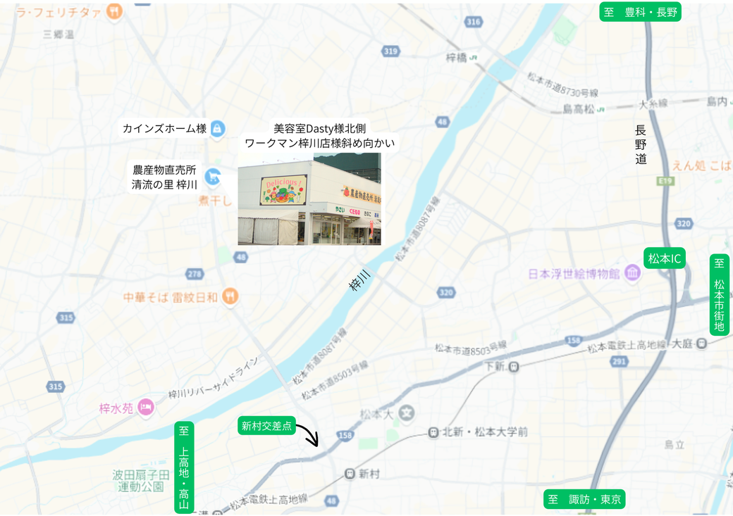 国道158号線を上高地・高山方面(西)に向かい、新村交差点を右折し県道48号を直進。道沿い右手に店舗があります。
